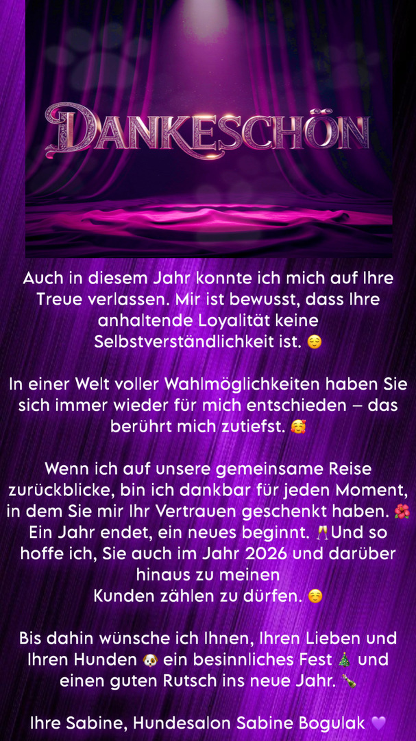 Liebe Kunden, liebe Freunde, das alte Jahr war aufregend und voller interessanter Aufgaben! Es war mal schön, mal schwer aber viel zu schnell vorüber. Ich möchte Danke sagen, für die tollen Hunde die ich pflegen durfte, für tolle Gespräche mit deren Besitzern und viele herzliche Momente in meinem Job! Ich bedanke mich für die Treue und das Vertrauen in mich und meine Arbeit! Ich freue mich auf ein spannendes 2018 und natürlich auf vielen wunderbare Stunden in denen ich ganz viele Wauwaus hübsch machen darf! Guten Rutsch ins neue Jahr 2018, Sabine Bogulak!