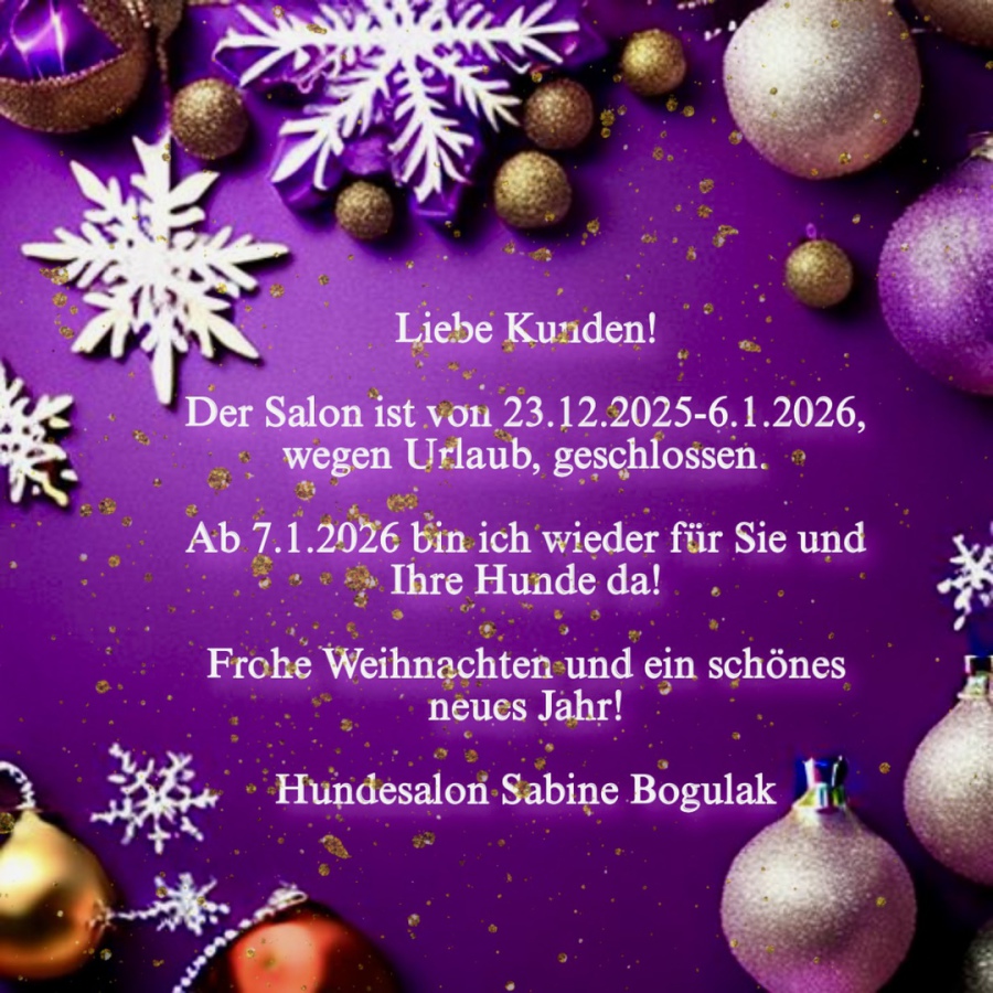 Mein Salon ist von 24.12.2022 bis 9.1.2023 aufgrund des Weihnachtsurlaubes geschlossen. Ab 10.1.2023 bin ich wieder für Sie und Ihre Hunde da und wir starten gemeinsam in ein neues Jahr.